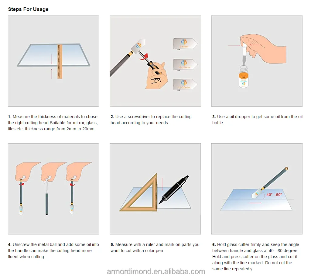Matters needing attention: 1. Please do not use rough glass or glass that is not smooth; 2. The corresponding glass cutter model should be selected according to the thickness of glass, and the pressure and speed should be used reasonably; 3. Before use, it is best to fill kerosene or other oil in the handle cylinder and ensure that it overflows from the knife edge roller; 4. In the process of cutting glass, the knife plate of the glass cutter should be close to the ruler and move parallel to the ruler. 5. When cutting glass curves, the curve gauge should be made to facilitate better cutting of curved glass. 6. In the process of cutting, the pressure should not be too heavy or too light when cutting in a straight line, but 20N is advisable. The knife handle and glass are cut in a straight line at an angle of 45 ~60 degrees; 7. In the process of cutting glass, you only need to hear the crisp cutting sound. The route crossed must not be repeated, otherwise the cutter wheel will be vulnerable. 8. It is suggested that a small amount of engine oil should be dripped into the working parts of the cutter wheel and the wheel shaft to prevent rusting and maintain the cutter wheel.