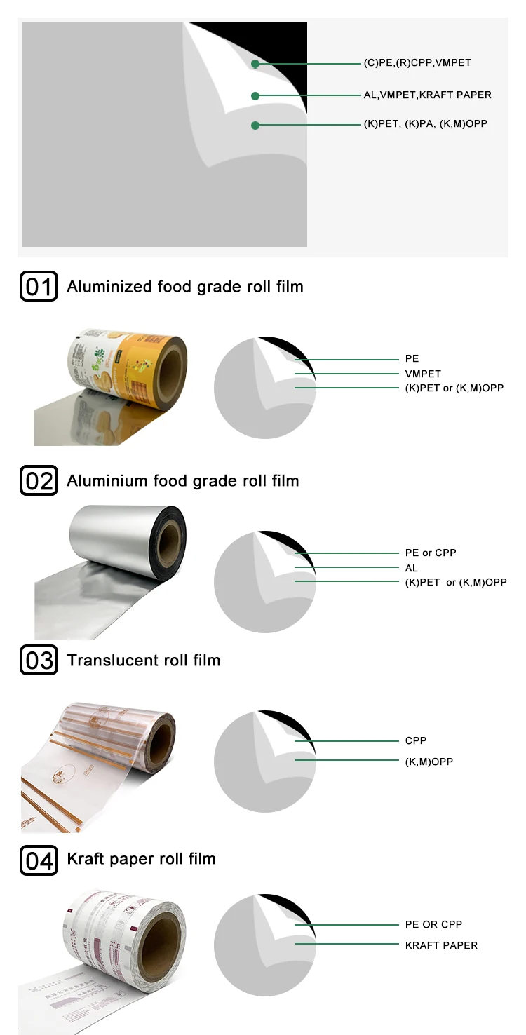 (1) PET + PE ,PA + PE/RCPP (2) PET + VEMPET + PE/CPP (3) BOPP+ PE/ CPP / VMCPP (4) MATT BOPP + VMPET/PET + PE (5) MATT BOPP + PAPER + PE /CPP (6) PET +AL+ PE/ RCPP (7) PET +AL + PA + PE/RCPP | ||