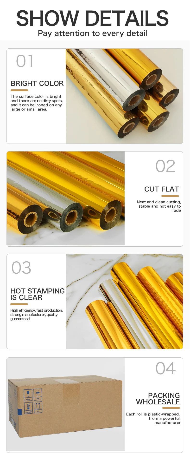 1. **Color Options**: Available in bright gold, silver, and holographic. 2. **Adhesion**: Bonds well to surfaces. 3. **Visual Appeal**: Provides a glossy, 3D effect. 4. **Application**: Easy to apply both manually and mechanically. 5. **Maintenance**: Cleanable and requires low upkeep.