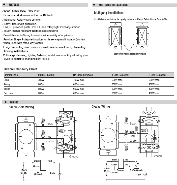 | DMR-P3 | Single Pole/ Three Way, 120V Incandescent Rotary Dimmer, Push ON/OFF | |||