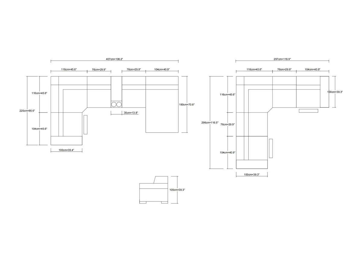 Size | Side Seat-101*100*77/100 Middle Seat*2-150*100*77/100 Chaise-180*101*77/100 |