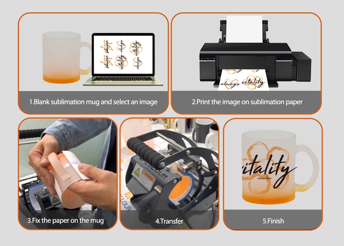 Process 1.Prepare blank sublimation mug 2.Select your pattern or logo 3.Print the image on sublimation paper 4.Fix the paper on the mug 5.Use the heat transfer machine to transfer 6.Peel off and finish
