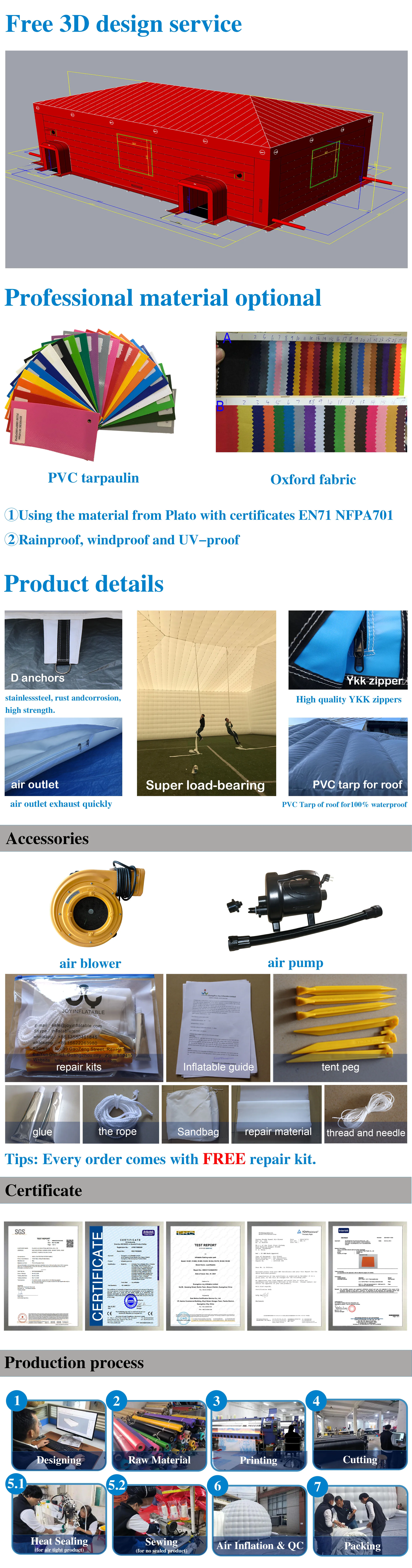 Accessories | air blower, air pump, repair kits, ropes, sandbags | |