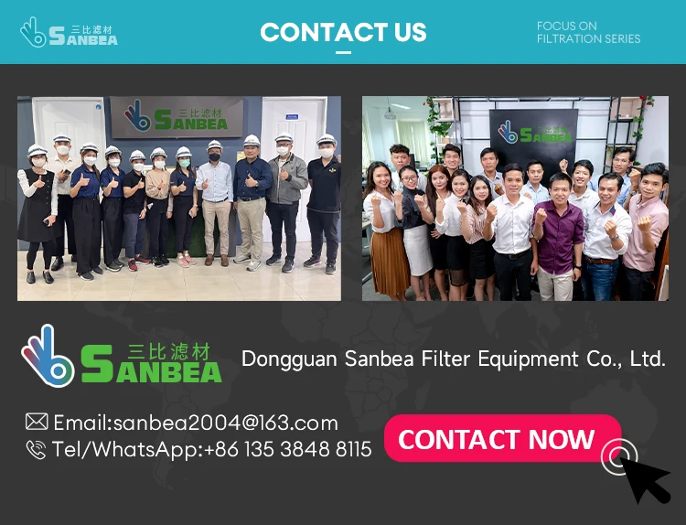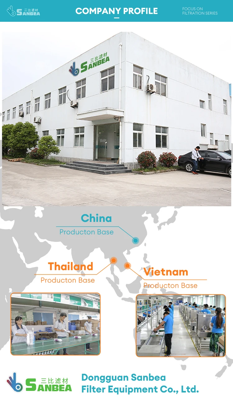 Dongguan Sanbea Filter Equipment company is located in Dongguan City and is an technology enterprise integrating development, manufacture and sales into a whole. The company possesses advanced equipment and technique, strong technology strength, complete detecting equipment and perfect quality assurance systems, Products are deeply popular in foreign and domestic clients. The company insists on taking satisfaction of clients requirements as core power of the enterprise based on the basic conception of surviving with quality and developing with credit from the establishment. And passed ISO9001:2015 quality management system certification. We sincerely hope to build up partnership relation with foreign and domestic clients to create prosperity together along with the development of the enterprise.