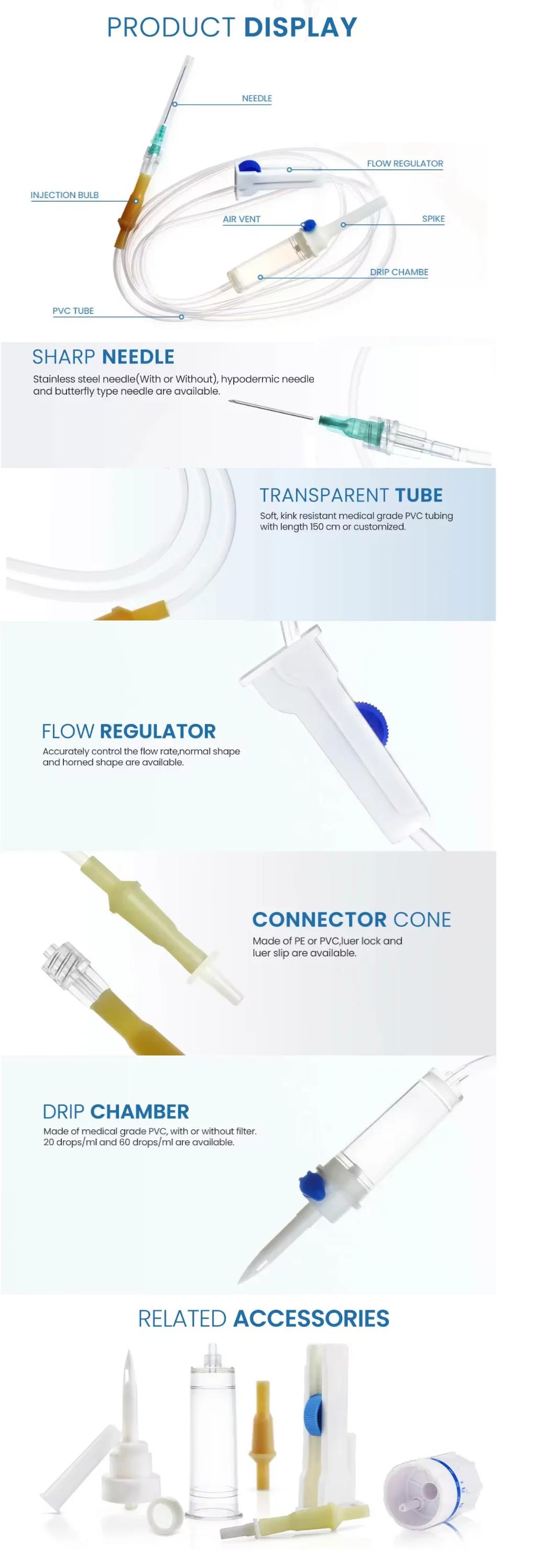 ABS spike with cap(PE) and air vent with air film, 48 drip-chamber(20drops/ml),12.8filter,150CM tube(PVC), Roller regulator(PE),Injection Site,Luer Lock Connector(PVC),21G x 1 1/2'needle,PE bag. Packing:25sets/middle bag,20 middle bags/ctn, 500sets/ctn, Size:64x 38x 33cm,G/N:12.5/11kgs,430000 sets/40HQ