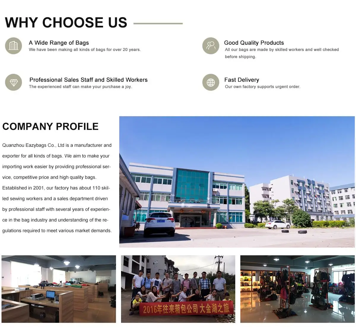 Quanzhou Eazybags Co., Ltd. is a bag factory, which specializes in designing, manufacturing and exporting all kinds of bags, such as diaper bags, tool bags, tactical bags, duffle bags, travel bags, computer bags, hiking bags and so on. Our company is located in Quanzhou where is one of the bags production centers in China and has the mature raw material supply chain for bag production. Our business goal is to provide you satisfied and high-qualitybags by means of ODM & OEM. We have our own factory and several cooperative factories located in Quanzhou and other areas such as Ganzhou Jiangxi Province, this enables us to produce 100,000pcs bags monthly and make urgent order in short time. Our production is strictly performed based on ISO9001. All the bags are checked thoroughly before shipping out. The sales department is also consisted of 8 enthusiastic and professional staff that can offer very professional advice and are quick in action to your any questions. The quality products and reasonable price is greatly satisfied by our customers from all over the world such as USA, Germany, France, Italy, Denmark, and Canada and so on.