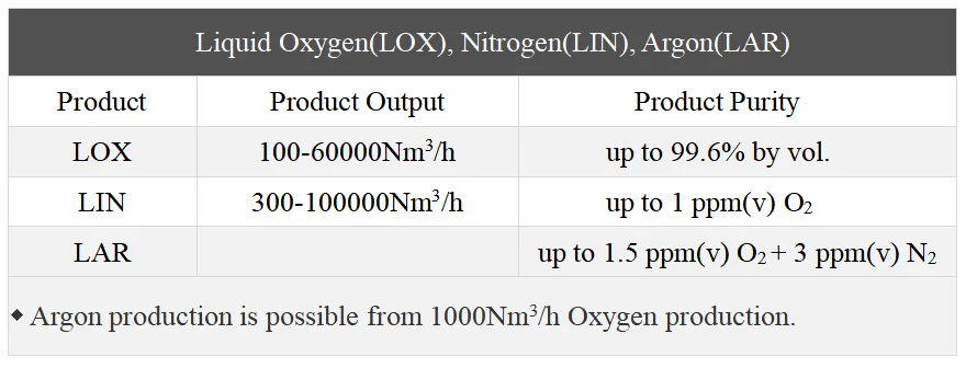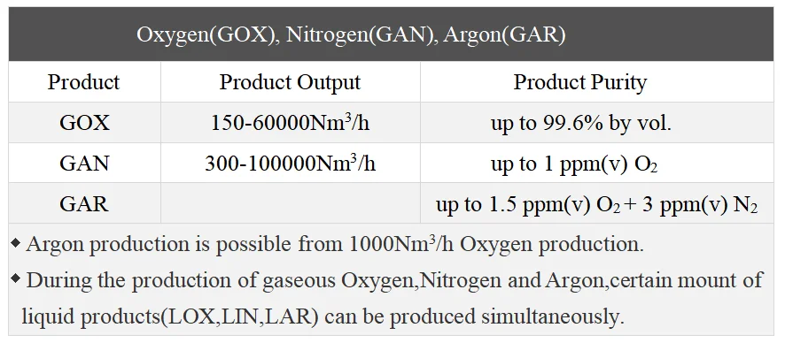 ◆ Large, Medium and Small-scale Air Separation Unit. ◆ High Purity Nitrogen Generation Unit. ◆ Liquid Air Separation Unit. ◆ Rich Oxygen Unit. ◆ Liquefaction Unit.