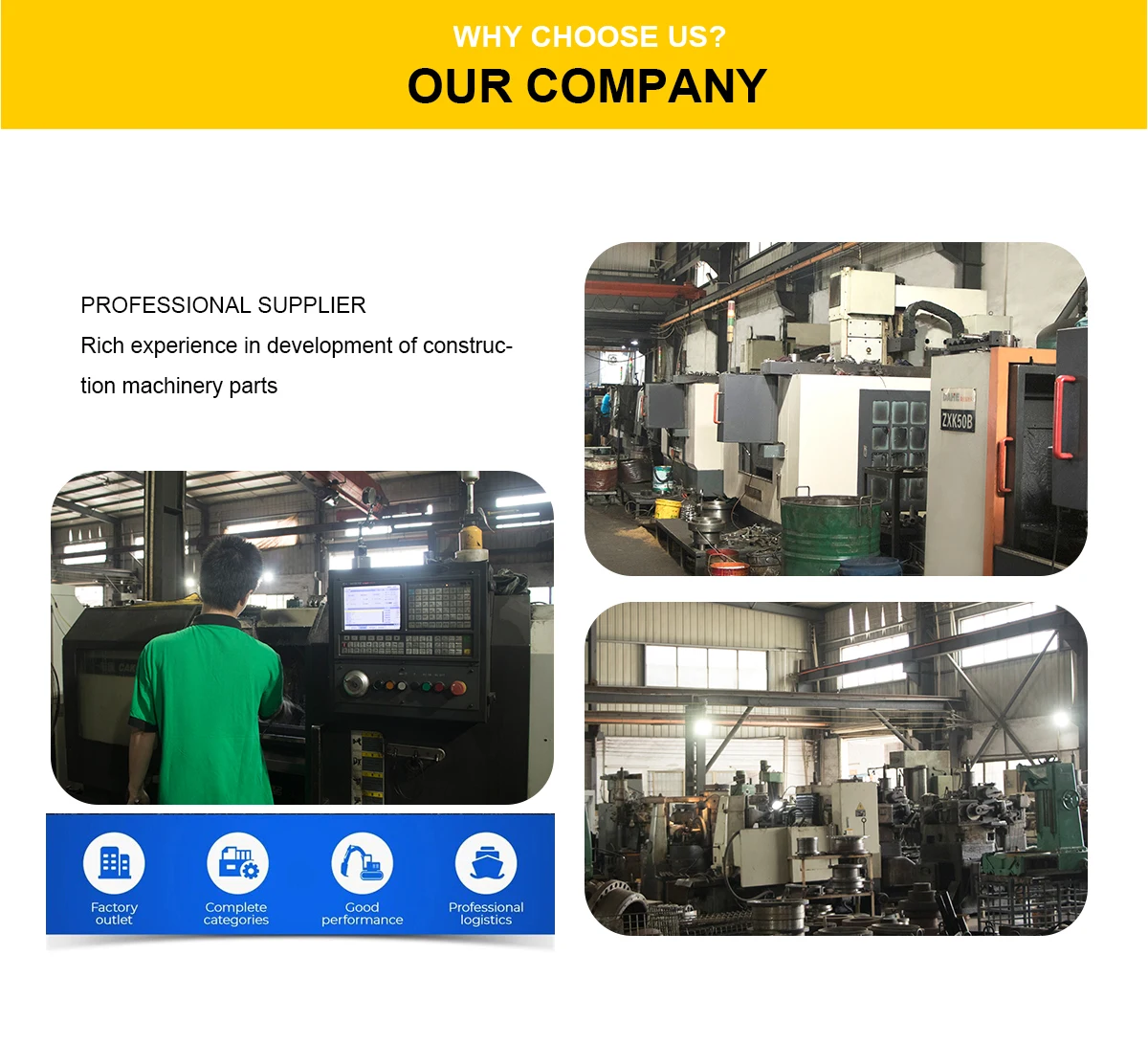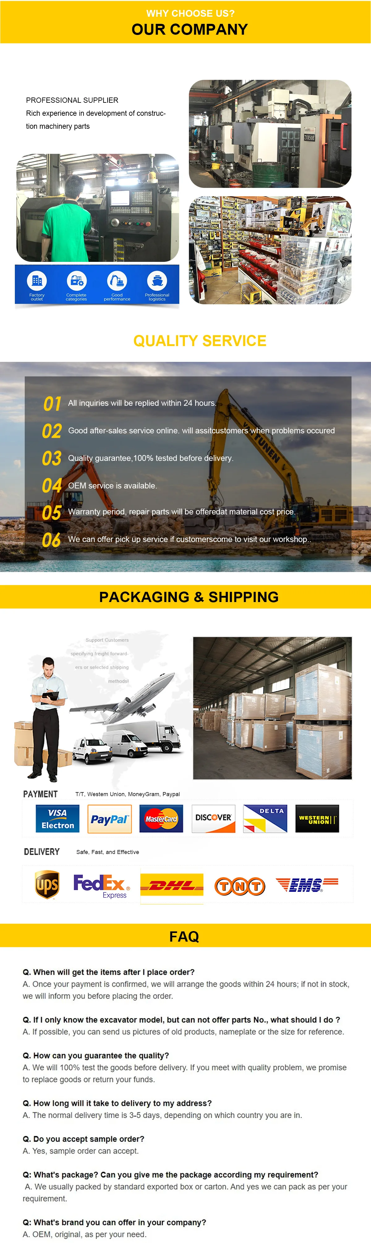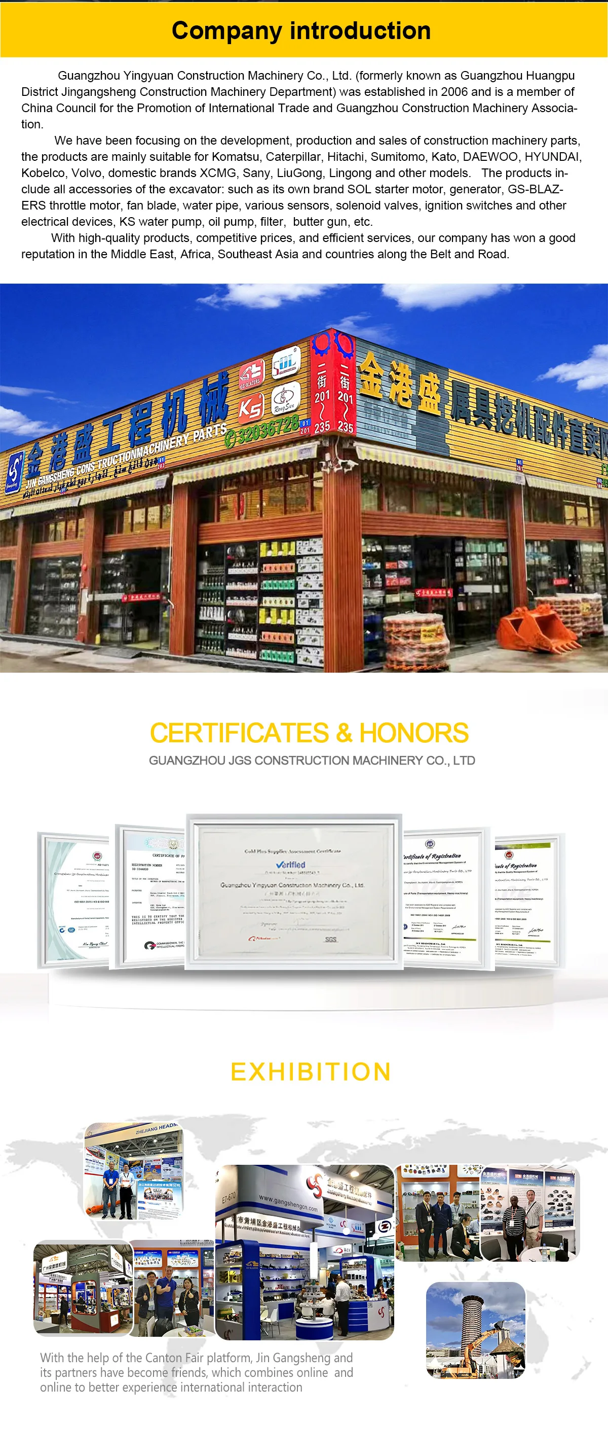 We have been focusing on the development, production and sales of construction machinery parts, the products are mainly suitable for Komatsu, Caterpillar, Hitachi, Sumitomo, Kato, DAEWOO, HYUNDAI, Kobelco, Volvo, domestic brands XCMG, Sany, LiuGong, Lingong and other models. The products include all accessories of the excavator: such as its own brand SOL starter motor, generator, GS-BLAZERS throttle motor, fan blade, water pipe, various sensors, solenoid valves, ignition switches and other electrical devices, KS water pump, oil pump, filter, butter gun, etc.