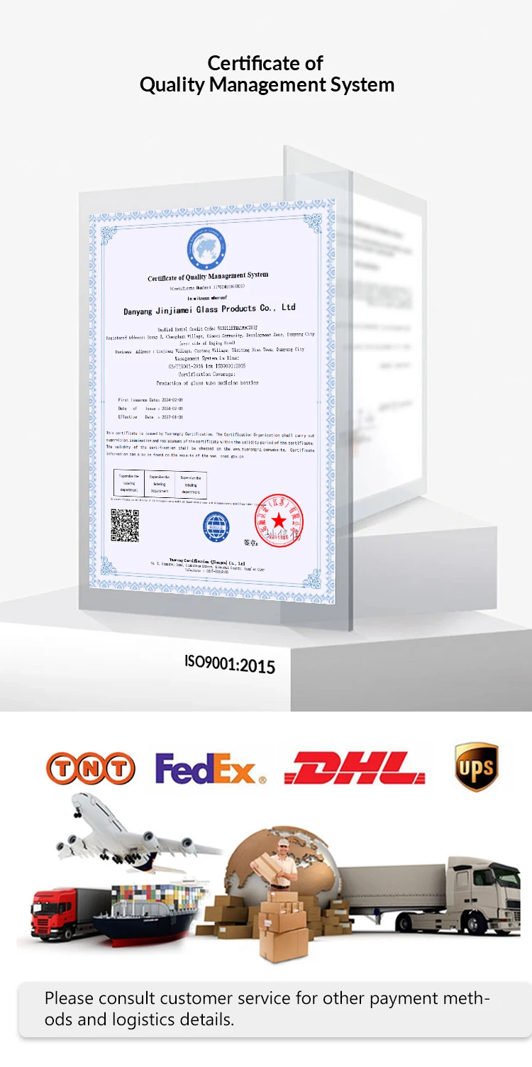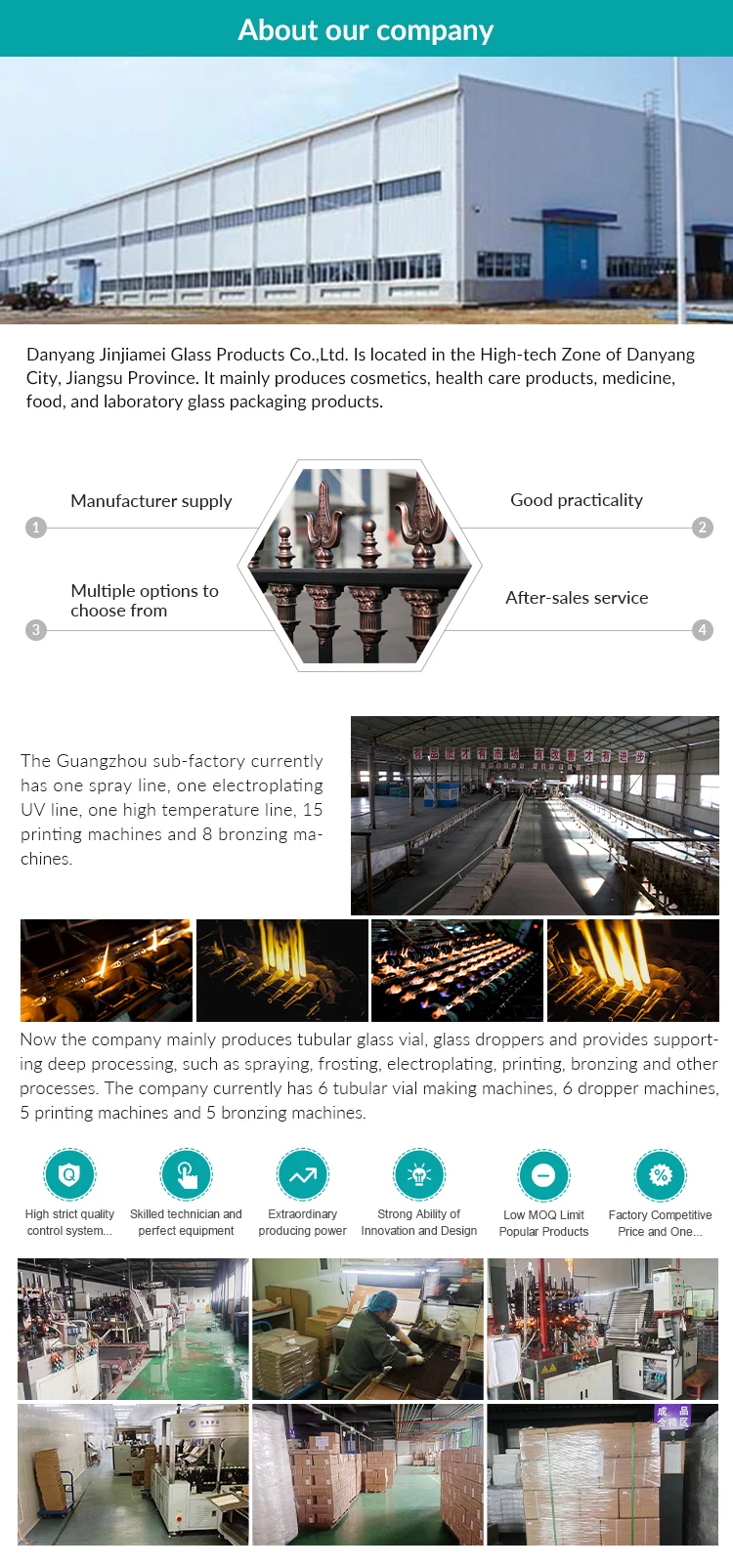 Danyang Jinjiamei Glass Products Co.,Ltd. Is located in the High-tech Zone of Danyang City, Jiangsu Province. It mainly produces cosmetics, health care products, medicine, food, and laboratory glass packaging products.