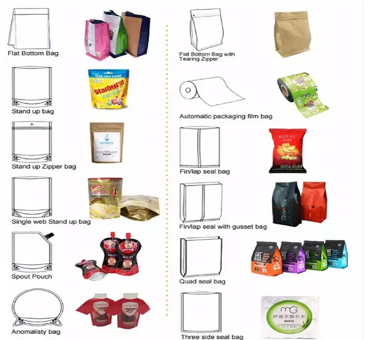 A2: Plastic packaging bags,PVC bags,kraft paper bags,Aluinum foil bags,BOPP bags,roll film,plastic and paper stickers. (Stand upbags ziplock bags,side gusset bags,flat bottom bags,vacuum bags,bags with valve and tin tie).