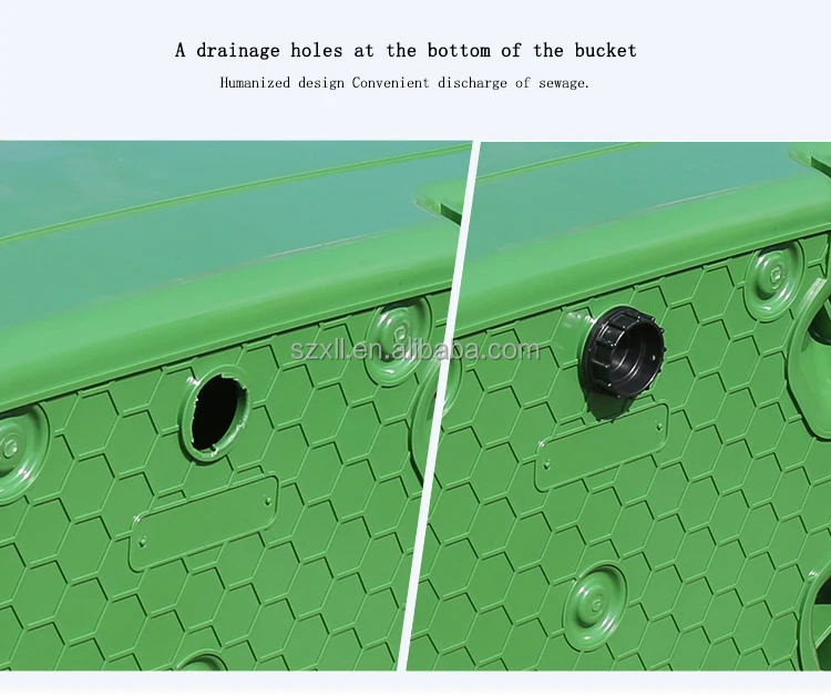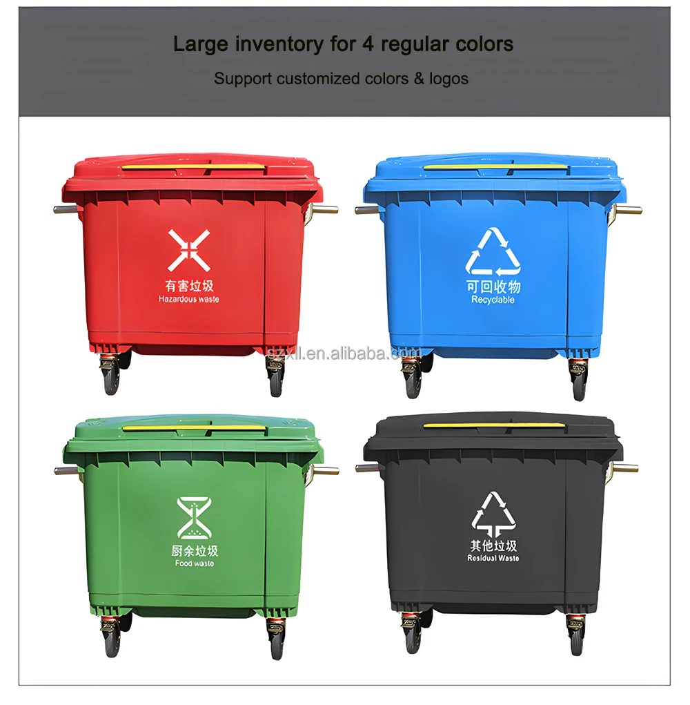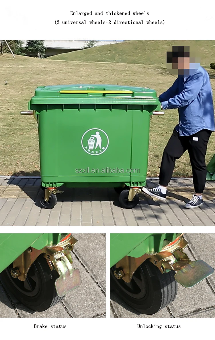 Packaging | 1. Each 660 liter dustbin contains a body, a cover, a stainless steel round pipe, 2 ABS latches, a removable drain plug & 4 wheels(2 directional wheels, 2 universal wheels). 2. The wheels are assembled, body, cover, ABS plastic latches, stainless steel round pipe and drain plug are packed separately. 3. The body are stacked, each package contains 5 bodies and 5 covers, the 5 covers are placed in the top body of each package, and each package is wrapped with stretch film. 4. The stainless steel round pipes are packed separately. 5. The ABS latches and drain plugs are packed in a bag. 6. All thing will be shipped together. |