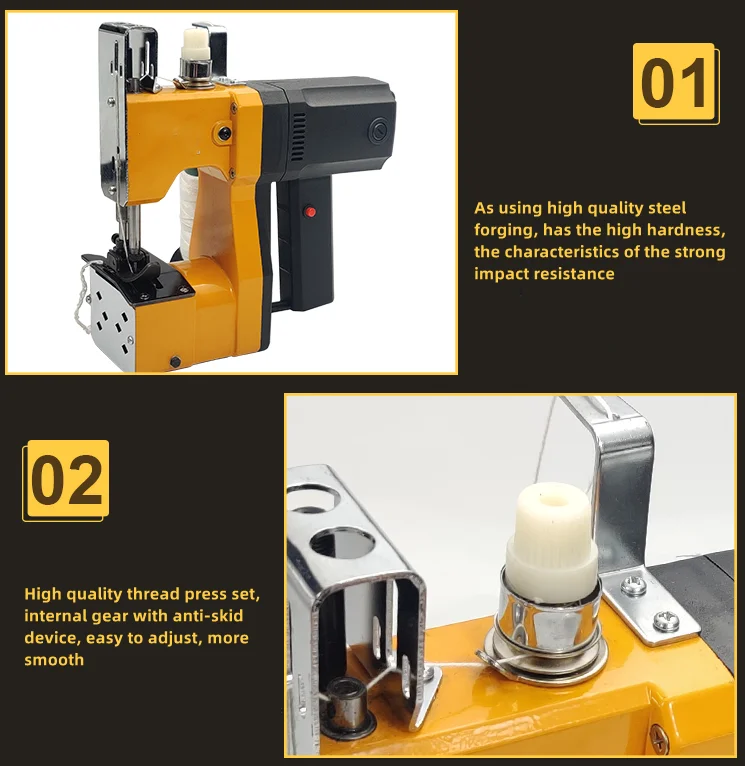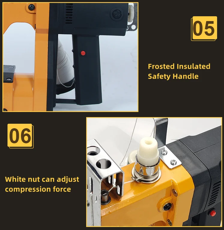 4.Adjustable pressing force: when sewing different packaging bags, the size of pressing force can be adjusted, which has achieved the effect of improving work efficiency and prolonging the service life of parts.