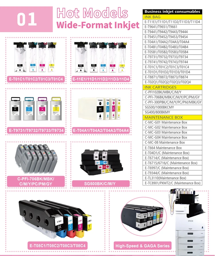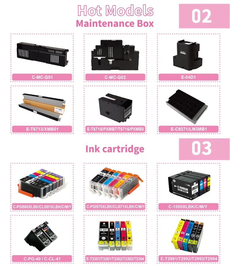 Model | Color | Ink Volume | Chip | For Use In |