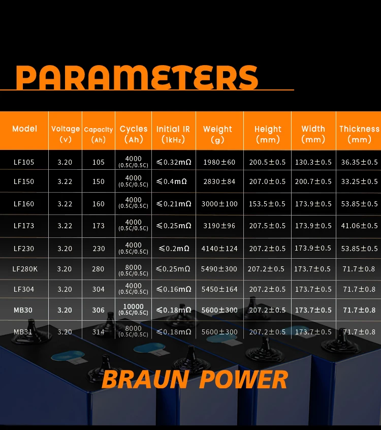 3.2V 105AH | 105AH | 0.2~0.5mΩ | 2kg | H196*W130*37 |