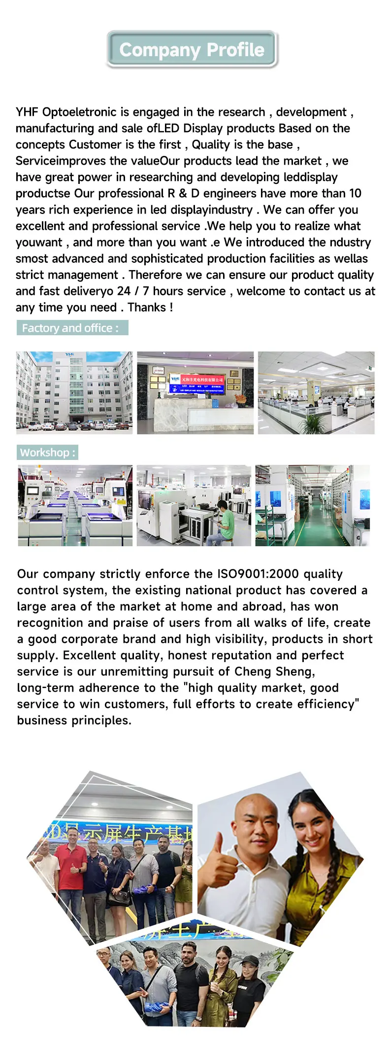 YHF Optoeletronic is engaged in the research , development , manufacturing and sale ofLED Display products Based on the concepts Customer is the first , Quality is the base , Serviceimproves the valueOur products lead the market , we have great power in researching and developing leddisplay productse Our professional R & D engineers have more than 10 years rich experience in led displayindustry . We can offer you excellent and professional service .We help you to realize what youwant , and more than you want .e We introduced the ndustry smost advanced and sophisticated production facilities as wellas strict management . Therefore we can ensure our product quality and fast deliveryo 24 / 7 hours service , welcome to contact us at any time you need . Thanks !