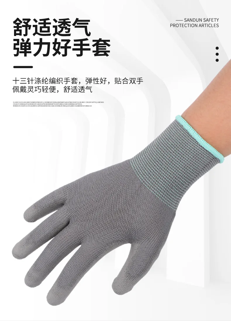 Thirteen needle polyester woven gloves, with good elasticity, fit hands and wear dexterously and lightly, comfortable and breathable.