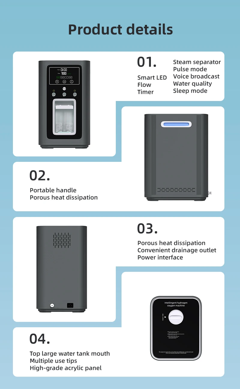 Electrolysis of water to produce hydrogen and oxygen is a safe, stable, and efficient product. The product is produced by electrolyzing pure water to generate hydrogen and oxygen, which are inhaled into the body through the nose to assist in the treatment and improvement of diseases. Adopting the SPE pure water electrolysis principle, only distilled water needs to be added. The physical electrolysis principle has no consumables, no side effects, and the product is safe, stable, and efficient.