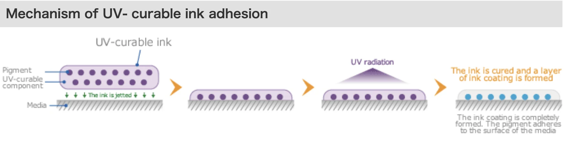 The UV-curable ink is cured and adhered to the media or substrate by UV radiation. The print is already dried when it comes out of the printer, allowing a short delivery request to be met. Printing on non-absorbent materials, including plastic, glass, and metal, is available.