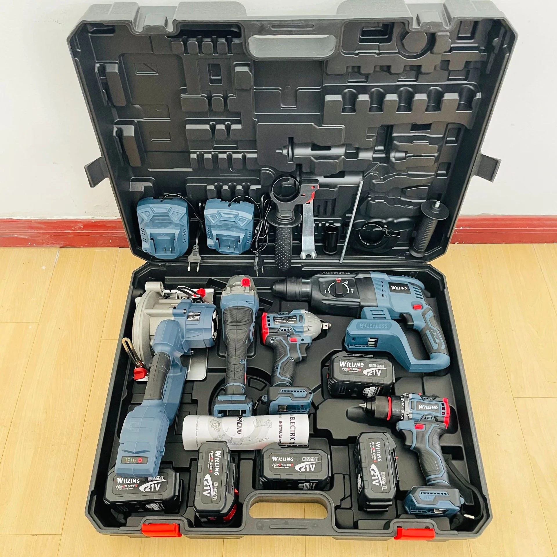 1.Electric drill 2.Impact wrench 3.Angle grinder 4.Light rotary hammer 5.Lithium battery*2 6.Charger 7.Plastic box