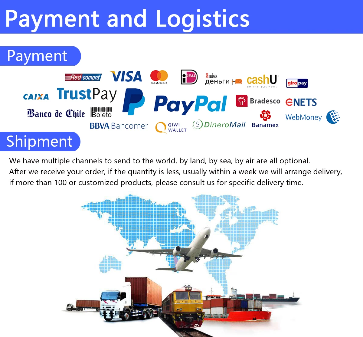 Q.When is it usually shipped? A. After we receive your order, if the quantity is less than 100, usually within 30 days will arrange delivery, if more than 100 or customized products, please consult customer service for the specific delivery time.
