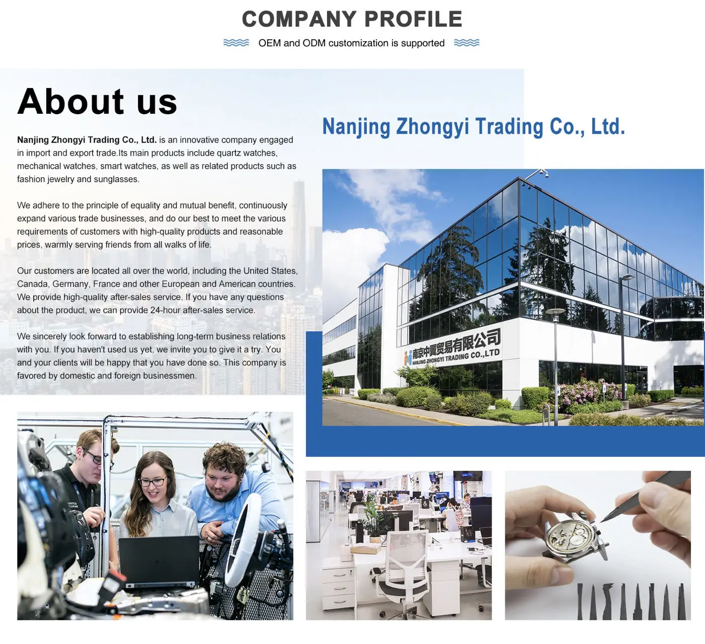 Nanjing Zhongyi TradingCo., Ltd. is a large-scale factory engaged in export trade,with independent research and development capabilities. It has a wide range of business, with production bases inShenzhen ,Guangzhou,Shantou, Zhengzhou,Nanchang, Wenzhouand Ningboin China.