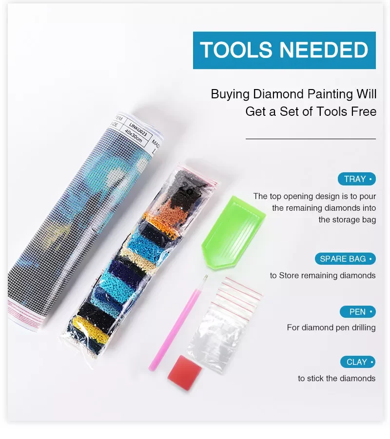 Tool bag | One pen,one plastic tray,one jelly glue, one canvas, one instruction paper,colorful diamonds | |||