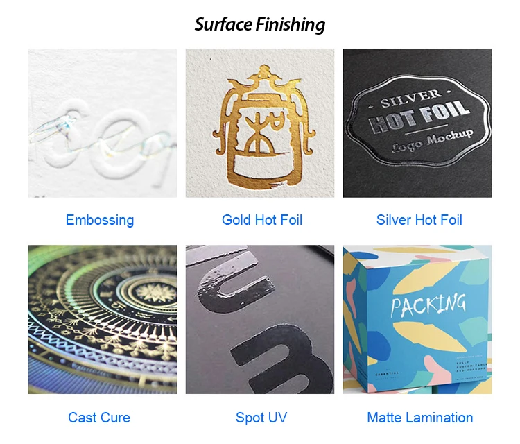 Surface Finishing | Glossy/Matte Lamination, Gold/Silver Hot Foil, Embossing/Debossing, Spot UV, Vanishing etc | |