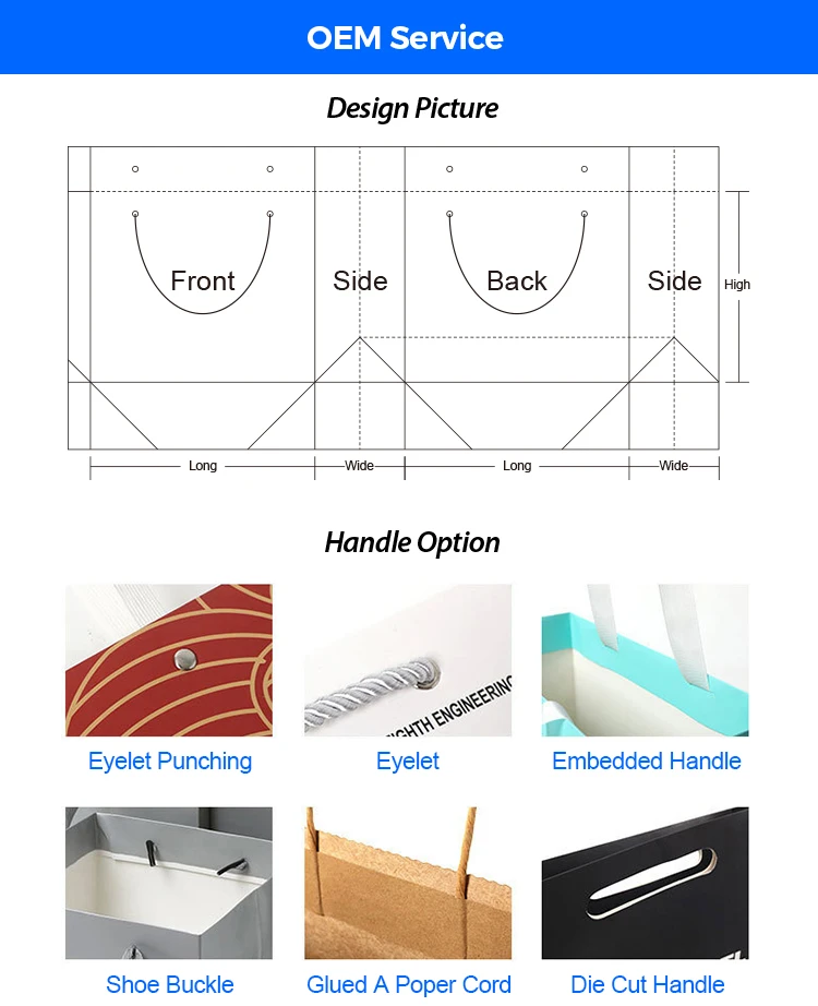 Handle Types | Ribbon Handle, PP Rope Handle, Cotton Handle, Grosgrain Handle, Nylon Handle, Twisted Paper Handle, Flat Paper Handle, Die-Cut Handle or Customized | |