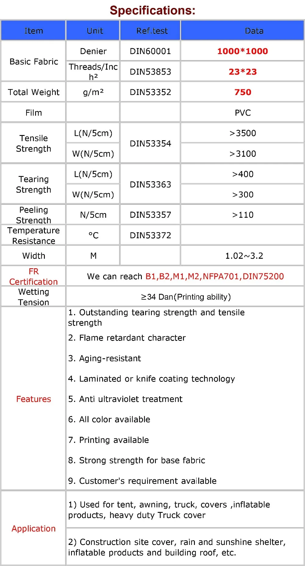 1) 100% high tenacity polyester yarns with PVC coating;