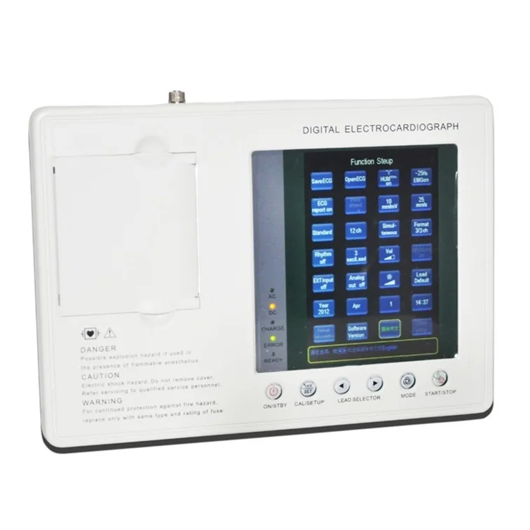 7inch 480*680 color display with wide angle view 80mm*20m roll type thermal paper 12-lead ECG simultaneous acquisition and display on screen Multiple Operation models: Manual/Auto/Rhythm analysis 3-lead recording with a rhythm lead Digital filters to eliminate EMG/AC interference and preventt baseline drift. Lead-off detection Built-in rechargeable 1800mAh Li-ion battery, 3 hours continuous working 110-230V,50/60Hz AC power supply 200 patient reports save/replay Built-in USB/RS232 interface for data transfer.