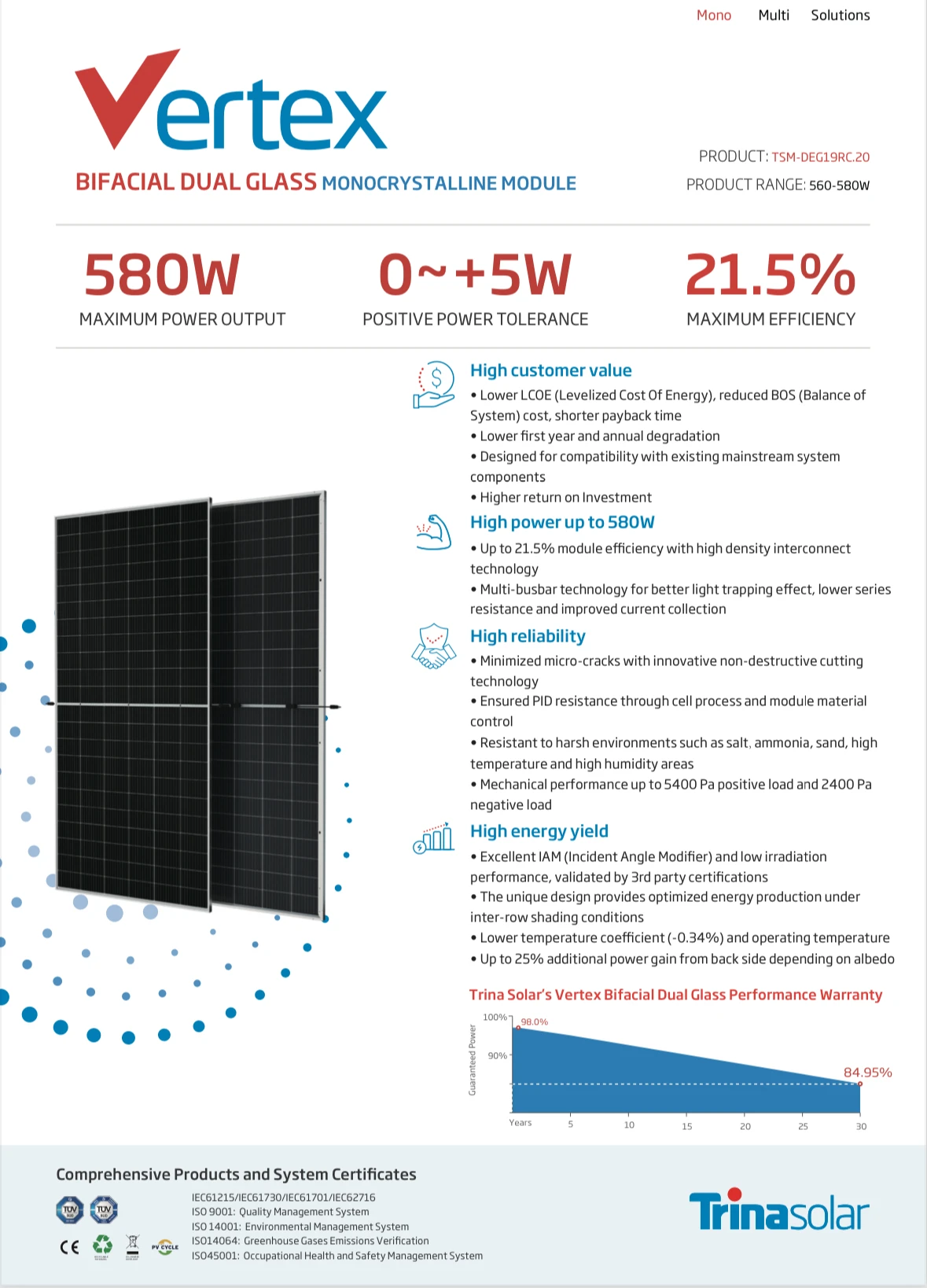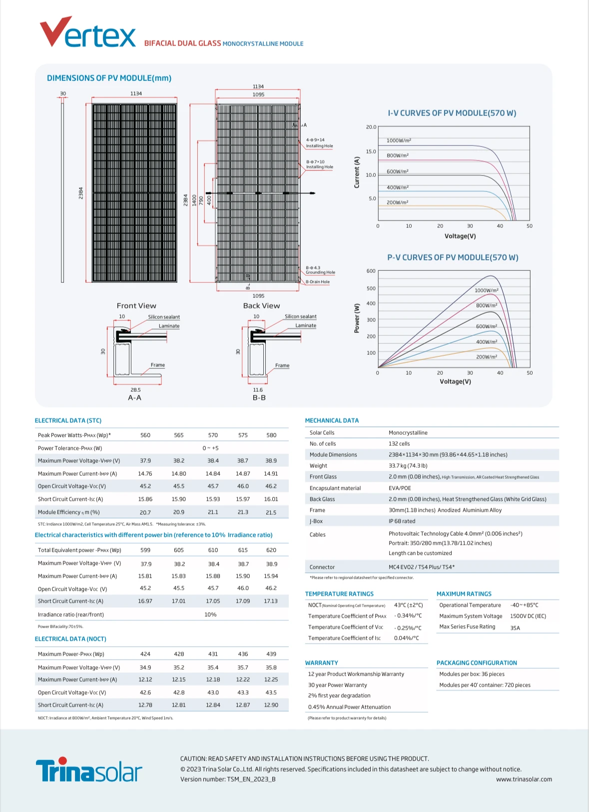 Standard test condition | Irradiance 1000W/m²,Module temperature 25℃, AM=1.5 | ||||||||||