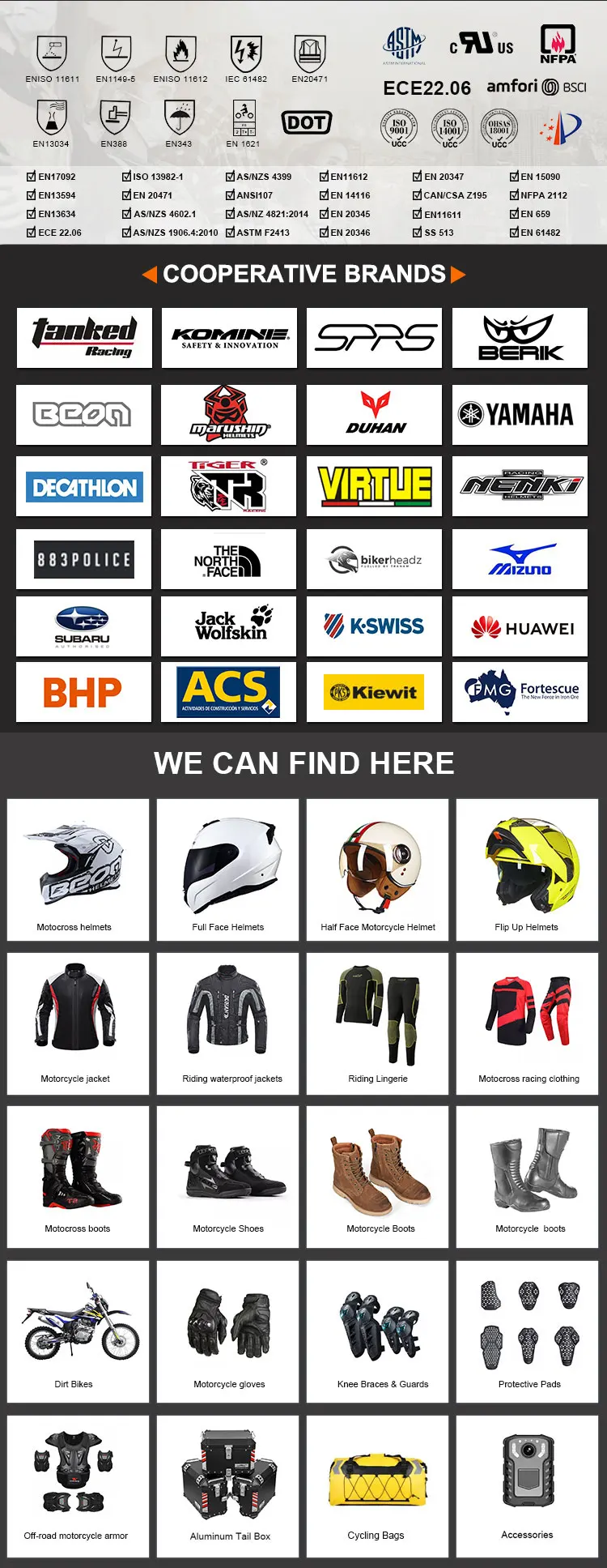 Q3: How does your factory do regarding quality control? A: We conduct orderproduction for the governmentand the . Compared with other factories, we have a stricterqualitymanagementsystem. We haveobtained ISO9001, ISO14001,OHSAS18001, CE,DOT,ECE and BSCI(TUV)certifications.