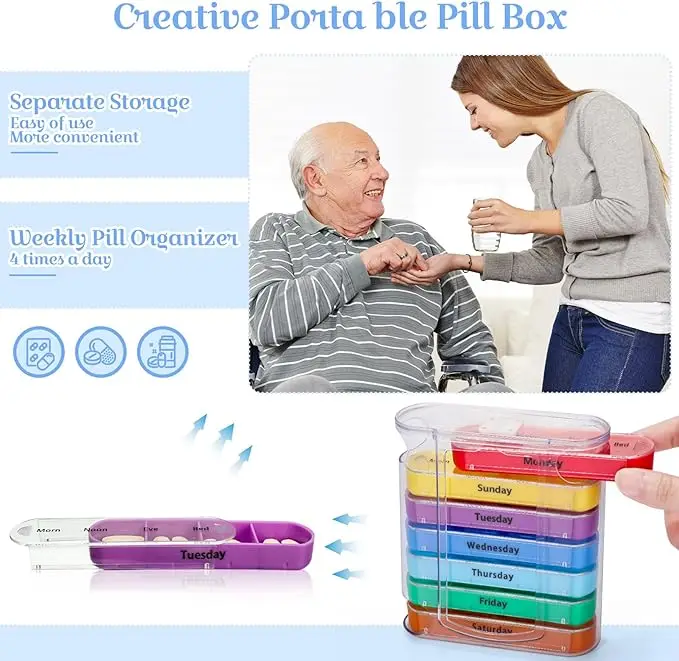 Features | 1.Bright colors every day make it easy to use this pill box reminder for all your needs. 2.the inner pill box can be easily removed individually, converting the large pill box into a portable pill box. 3. The buckle is easy to open and makes a safe snap sound when closed. 4.Long lasting printing, it is made of food-grade, BPA-free materials. |