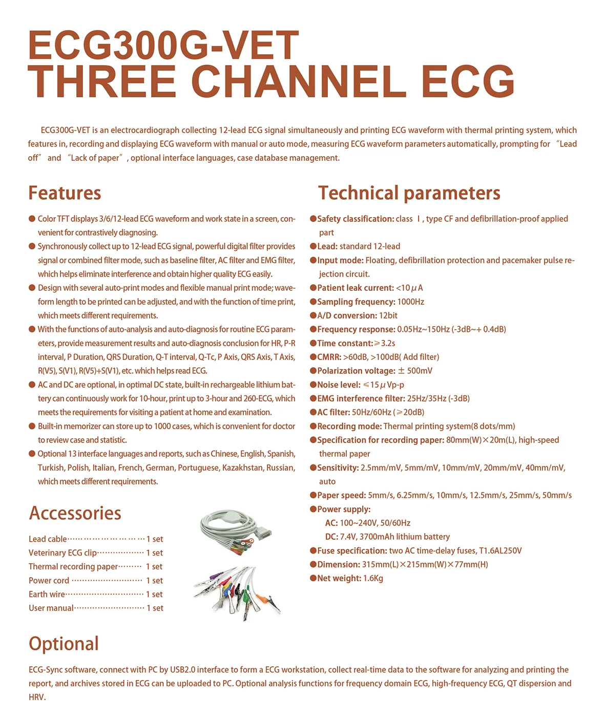 MCECG300GV is a three channel electrocardiograph sampling ECG signals simultaneously and printing ECG waveform with thermal printing system, which features in, record and display ECG waveform in manual or auto-mode, promptings for “Lead off” and “Lack of paper”, multiple languages interface, support both AC and DC for power supply, optional rhythm lead that convenient for abnormal heart rate observation, case database management, etc.