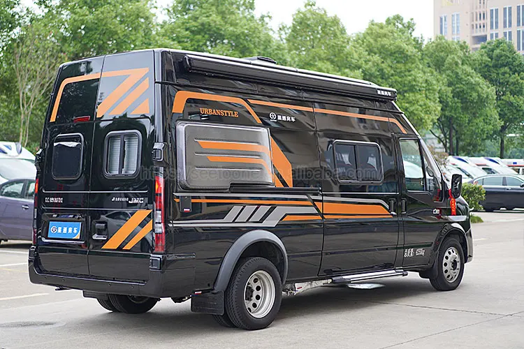The motorhome vehicle is based on JMC Fushun long-axis high-top chassis. In terms of power, the car is equipped with 2.0T diesel engine, matching 8AT automatic transmission, front-to-rear drive form, the maximum power is 107kW, bringing abundant power output. The tank capacity is 80L. The body size is 5998×2098×2700mm, the length is less than 6m, and the blue plate C license can be driven. The appearance is mainly bright black, decorated with orange and gray lines, stylish and beautiful.