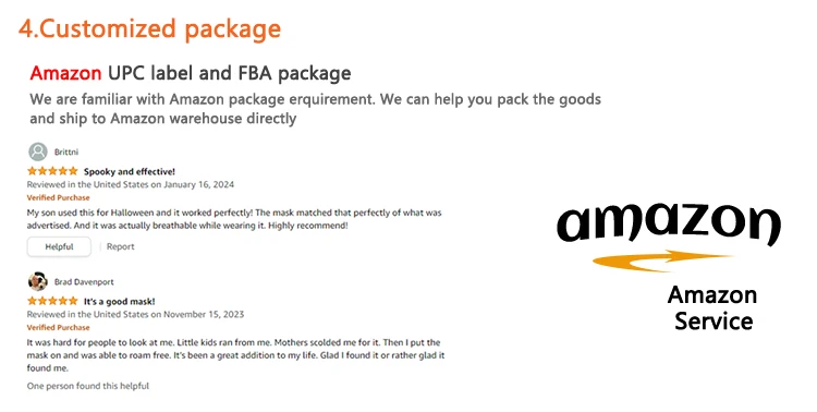 8. Packing details | Each mask into a polybag with header card or hangtag, then 48pcs into master carton. |