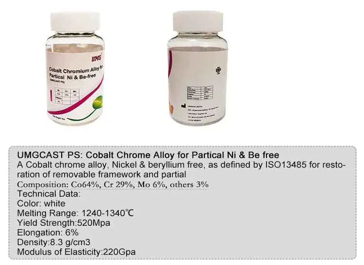 Product:Cobalt Chrome Alloy for Partical Ni & Be free Model:UMGCAST PS Size:¢8X16mm Shape:Round Usage:restoration of removable framework and partial dentures Chrome:29% Molybdenum:6% others:<3% Cobalt:64%