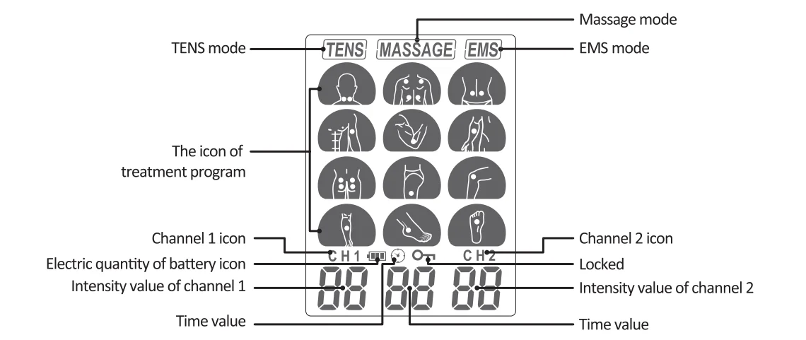 Treatment mode | TENS, EMS and Massage | |
