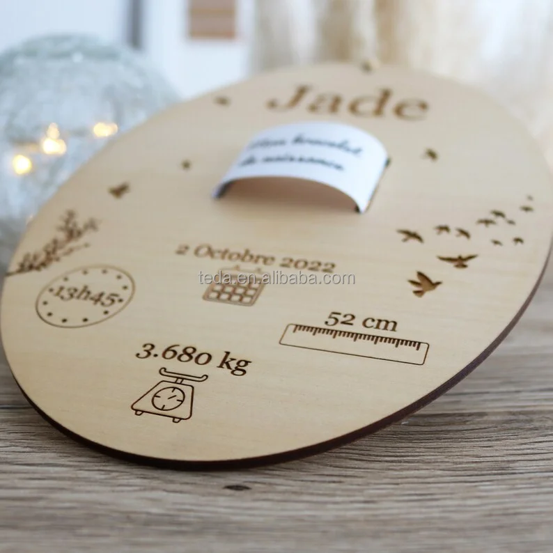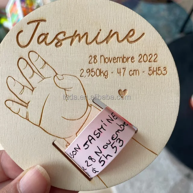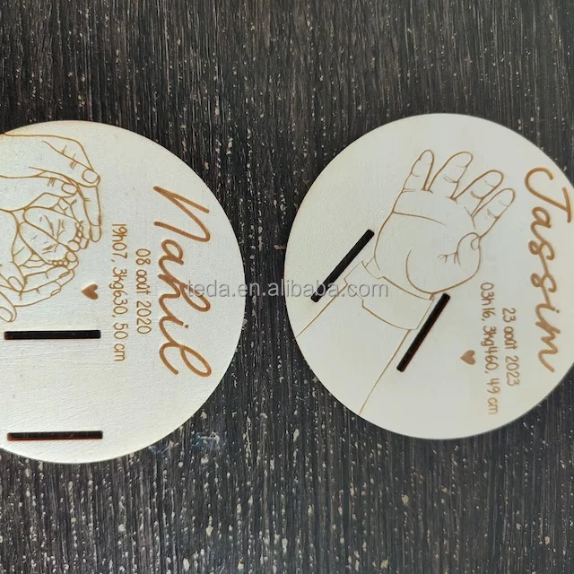 Free custom Hot sale Souvenir Laser engraved birth Bracelet Holder Wooden Support cards sign for Newborn Gifts