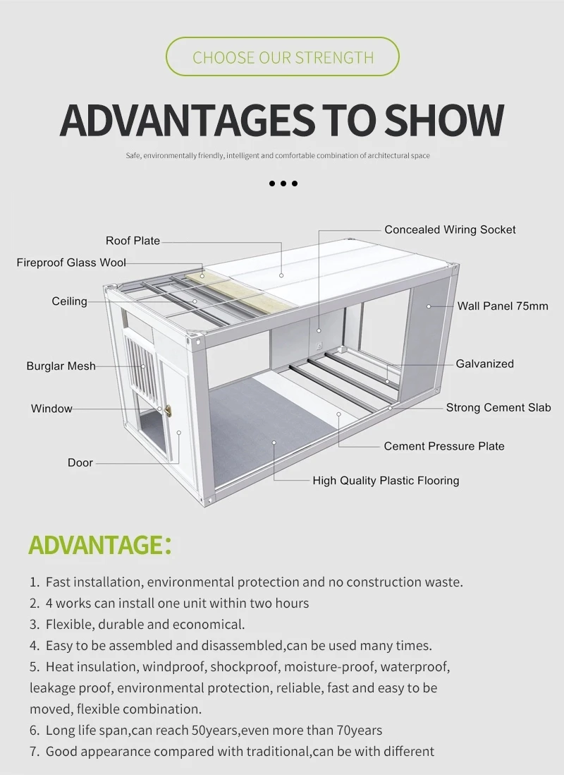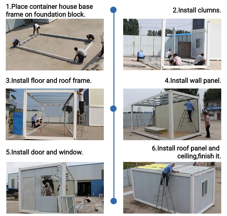 3.Take less space in container:for only the frame,one 20ft container can load 25 units,one 40HC container can load 50 units;for full house with one door,two windows,wall,roof,floor,one 20ft container can load 5 units,one 40HC container can load 12 units. | ||||||||