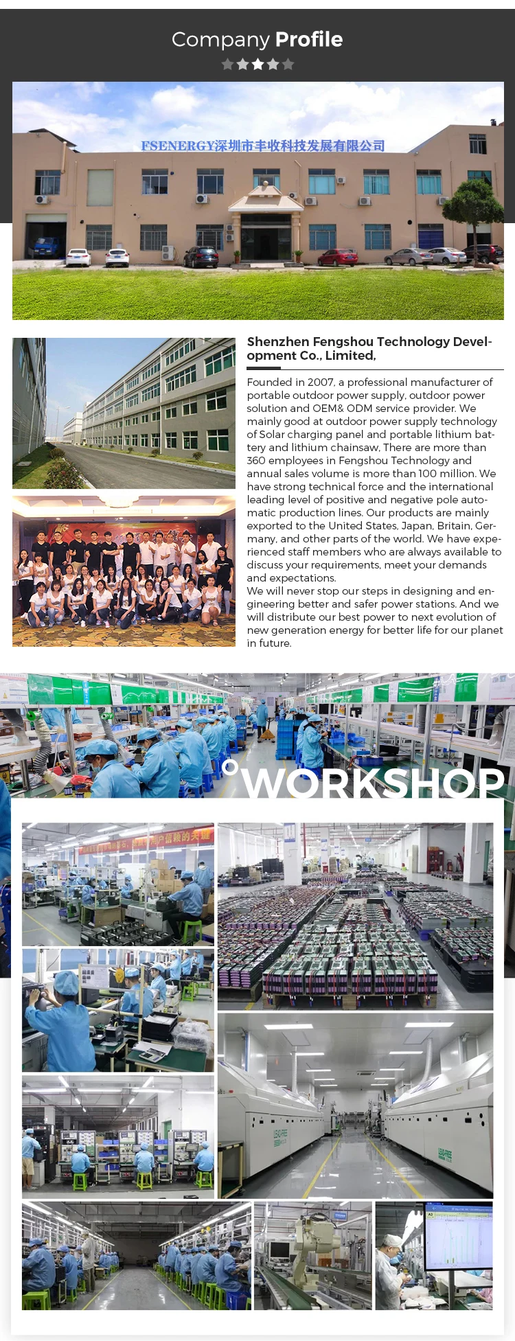 Our Company Shenzhen Fengshou New Energy Technology Co., Ltd. was established in 2007. Our company has a solar module factory (1500MW capacity), a battery energy storage factory (200,000 capacity per year) and a solar inverter factory. Products comply with CE, UL, TUV and other standards. Fengshou New Energy provides one-stop solutions, including grid-connected, off-grid, hybrid energy storage solar systems,solar outdoor portable energy storage and LIFEPO4 high-efficiency energy storage batteries, with excellent product quality , reasonable price and worry-free after-sales, exported to more than 100 countries and regions around the world. We have been deeply involved in the new energy industry for more than 16 years, leading the industry in advanced product technology, quality management and control system. There are more than 360 employees, and the plant covers an area of 25,000 square meters.We have passed the ISO9001 quality management system certification. FSENERGY has formed a diversified development pattern with solar energy storage systems, solar outdoor portable energy storage and LIFEPO4 new energy storage batteries as the main products, we always adheres to the business philosophy of win-win for customers, employees and enterprises, laying a solid foundation for the company's sustainable and stable development. Production progress We have professional technicians and production factory, only do high quality portable solar panels. Dedicated to creating outdoor travel convenient electricity, for customers to create a convenient way of life! Packing & Delivery Packing:Brown neutral packaging with bubble bag for shockproof Delivery: 1.by express: DHL/UPS/Fedex/TNT etc. 2.by sea/air 3.by forwarder of customer Port: Shenzhen Port Delivery time: 3-7 days FAQ Q:Could I have a sample order for solar panels? A:Yes, we welcome sample order to test and check quality. Q:How much is the shipping cost? A:You can contact us before placing an order to get the latest and best shipping prices. Q: What are the advantages of portable solar panel? A: Portable solar panel are a new way of outdoor charging method. You can build a outdoor solar generator system by solar panel and power station. Now, we offer 60W 100W 120W 200W foldable solar panel. If you have requirements for other models, please contact us. Q: Do you support OEM/Customized? A: Yes, any wattage/folds panel can be customized, and also can print your LOGO on. We will produce samples according to your needs, and mass production will be carried out after your confirmation. Q: What's the warranty of our products? A: All our products have at least one year warranty.The warranty period of different products will be different, if you have any questions, please contact us. Q: What's the lead time? A: We have sufficient inventory to meet your needs. Under normal circumstances, a small sample order will be sent out within 7 working days, and the delivery time for bulk customization is approximately 20 working days. Please contact us for more specific delivery times. Contact information |