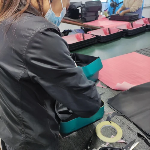 5.Stick Lining | 6. Sew zipper&Plastic strip | 7.Combine | 8.Quality inspection |