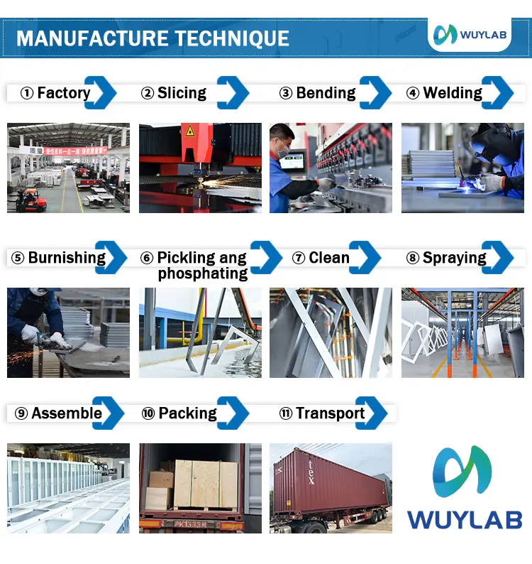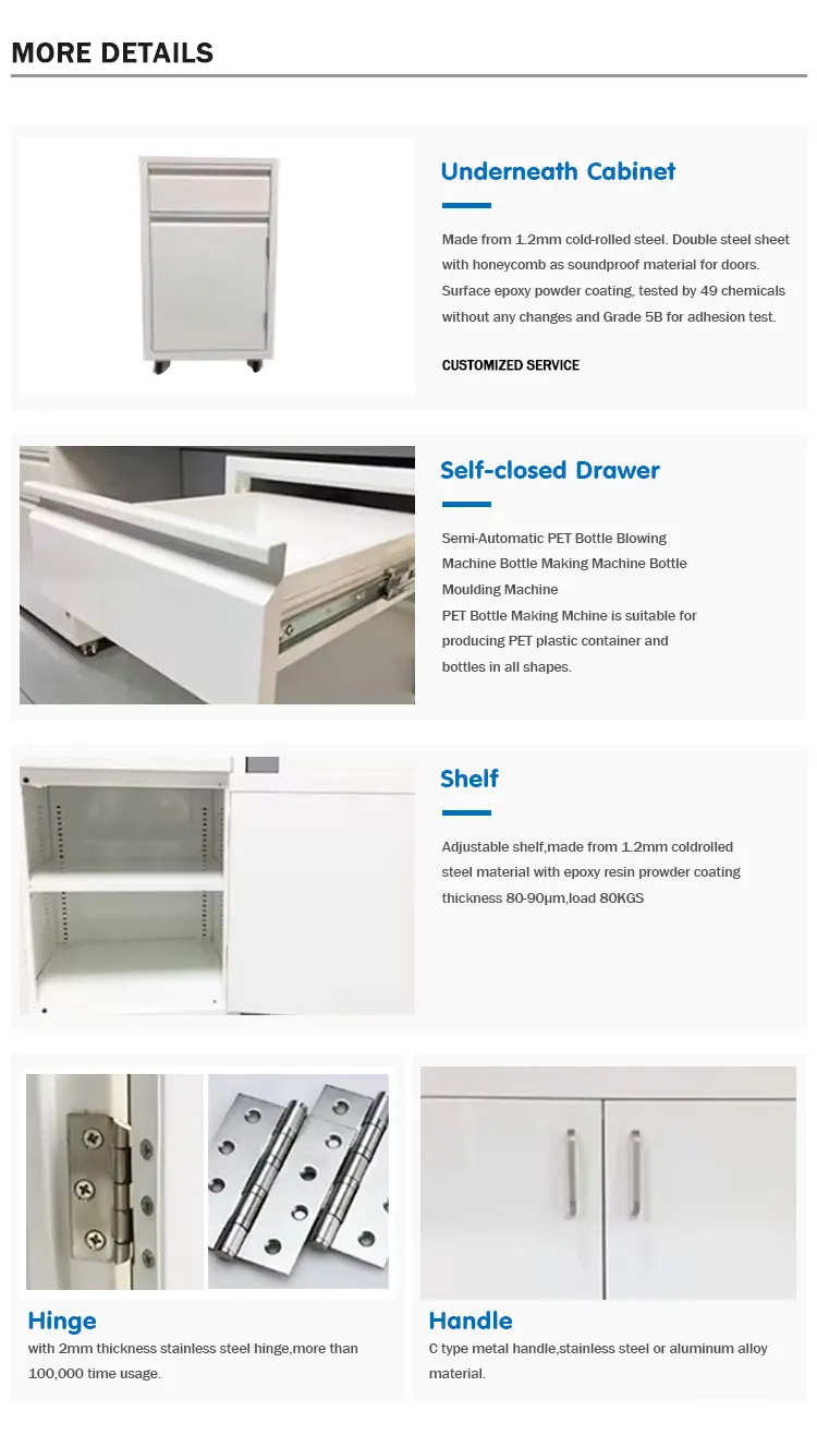 Base cabinet: | Main body:1.0/1.2mm thick durable and chemical resistant cabinets,electrostatic epoxy powder spraying.Double panels doors and drawers.Full height removable back provides full access to service chase, stainless steel hardware | ||