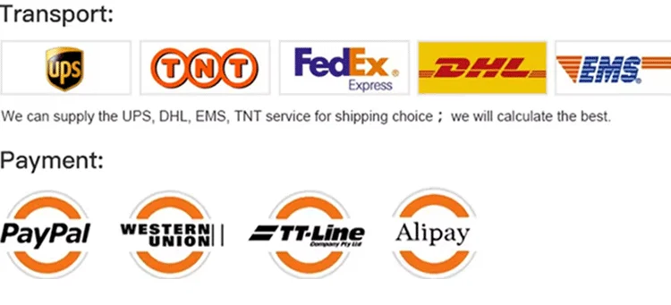 By sea or air shipment,normal forwarder and nominated forwarder are both okay.By express,DHL、UPS、TNT & OCS all are most used.Also shipping service from Alibaba is acceptable.. 5:What payment methods do you accept? We accept Paypal for trade assurance order,T/T, L/C,If choose in T/T,usually is 30% deposit and pay 70% deposit before shipment.
