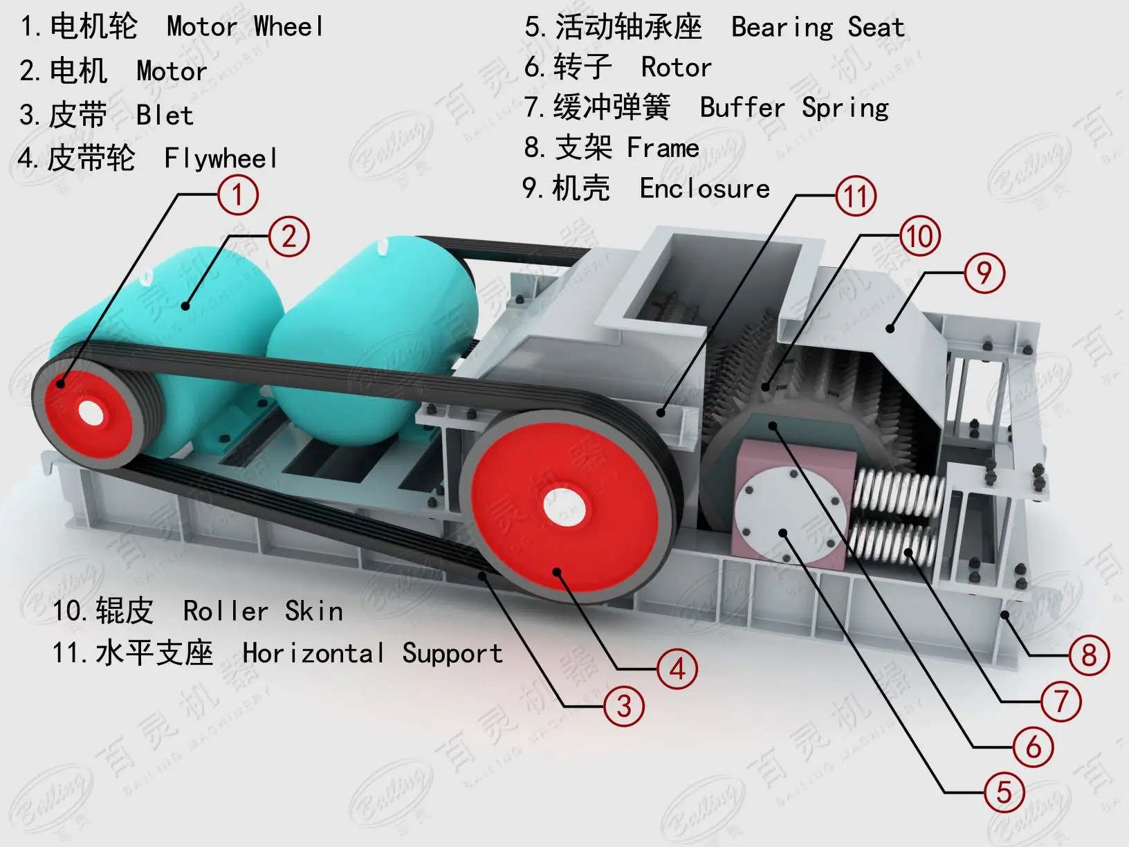 The double-roller crusher is also called the double roll crusher. It uses two motors to drive the two rollers to squeeze and grind the material. It is suitable for medium and fine crushing of materials with various compressive strengths ≤160 MPa.