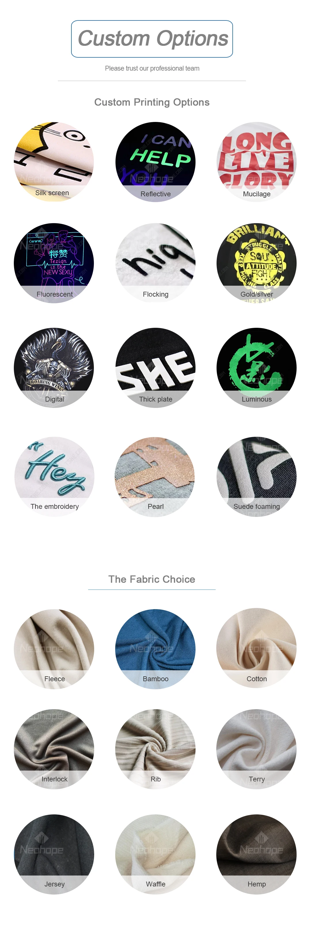 Fabric Content | Custom Fabric | 100% cotton 100% combed cotton 100% polyester 90% cotton 10% spandex 60% cotton 40% polyester 50% cotton 50% polyester Or according to the customer's requirement. | |