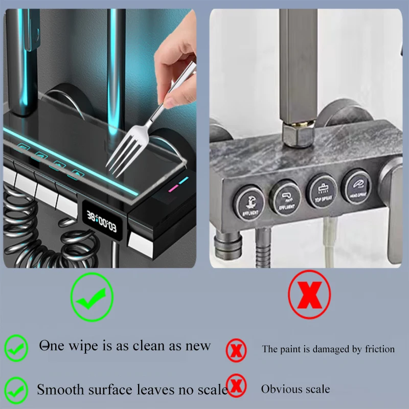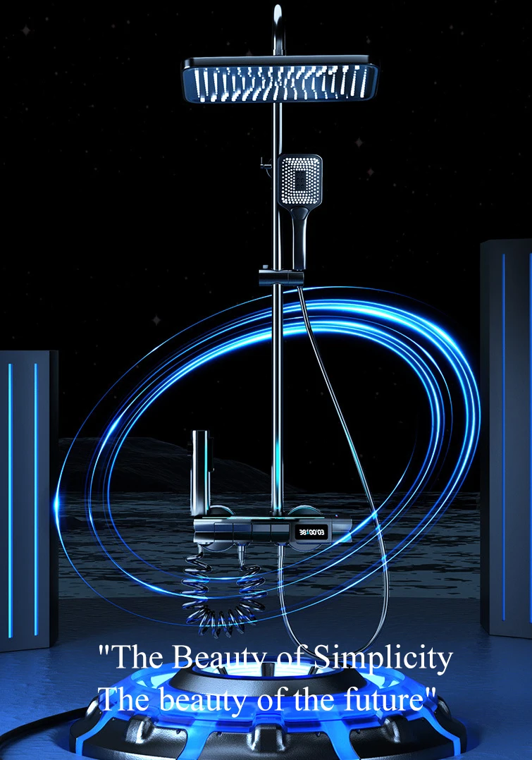 1.One-touch piano key switch mode····Real-time display of temperature 2.Hot and cold water rotation adjustment····Air booster water massage 3.4 functions and 3 modes of water discharge····Innovative ambient light