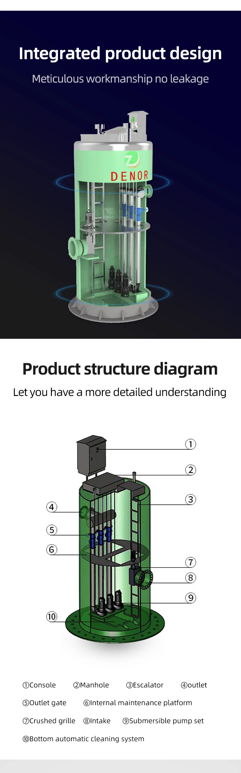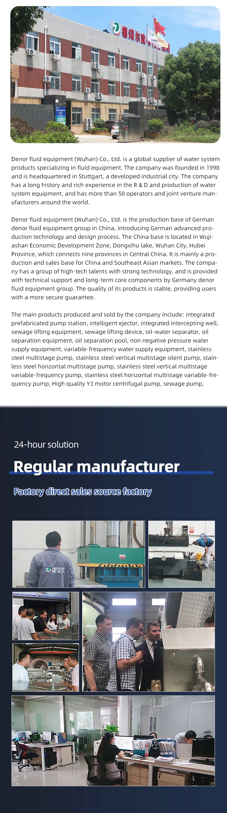Denor Import and Export (Hubei) Co., LTD., founded in 2018, is located in A11-1-5, Zhongna n High-tech Science and Technology Innovation Park, Chuanggu Road, Dongxihu District, Wuha n City, Hubei Province.Since its establishment, the company has been adhering to the "ethic-based, integrity-base d, win-win development" corporate values, emphasizing brand, integrity, and accelerating development in the water supply and drainage industry. Denor has passed IsO9001 quality management system certification, OHSAS18001 Occupational Health and safety management system certification, ISO14001 environmental management system certification; The company has integrated assembly pump station, integrated water treatment pump station, sewage lifting equipment, oil-water separator, grinding grille, non-negative pressure complete sets of water supply equipment, a total of more than 50 patents. Denor carefully treats every part of the product, ensures the good operation of the equipment, always meets customer needs with high-quality product quality and perfect after-sales service, and comprehensively solves customer water system solutions. Denor promises to produce products that are responsible for customers and to be a socially responsible enterprise!