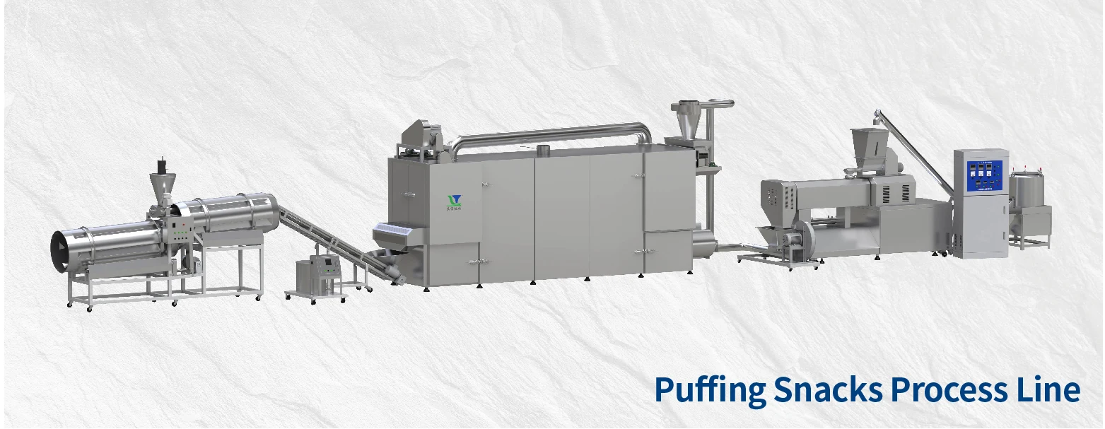 The puffing snack process line uses corn, rice, wheat, oats, barley, etc. as raw materials, and can produce puffed snacks with stable quality and various shapes and textures. It can automatically complete the mixing, extrusion, forming, filling, cutting, baking, seasoning, and other processes at one time to produce puffed snacks with various formulas and flavors. The production line is easy to operateand maintain, capable of producing a large amount of puffed food in a short time.