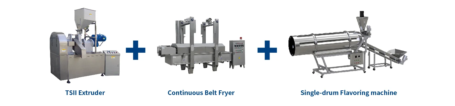 The Kurkure/Cheetos/Niknak/Corn Curls Process Line is a typical type extruded food machine studied and developed by us on the basis of learning from advanced technology in the world so that both its technical performance and products quality reach to the most advanced level in the world. This line can finish mixing, extruding, shaping, core-filling, cutting, baking and flavoring in one-pass operation automatically. This line features lots of types, flexible, collocation, extensive applied raw materials, various snacks and easy operation.